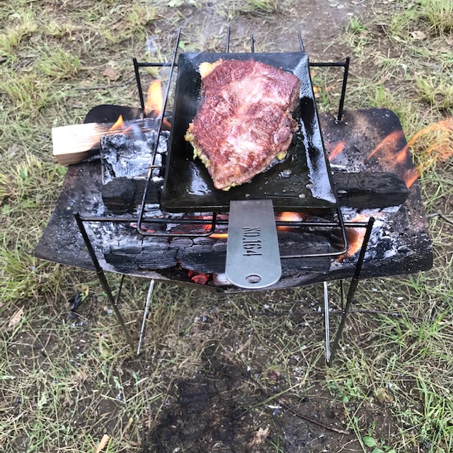 焚き火で鉄板で焼くステーキ、最高に旨い